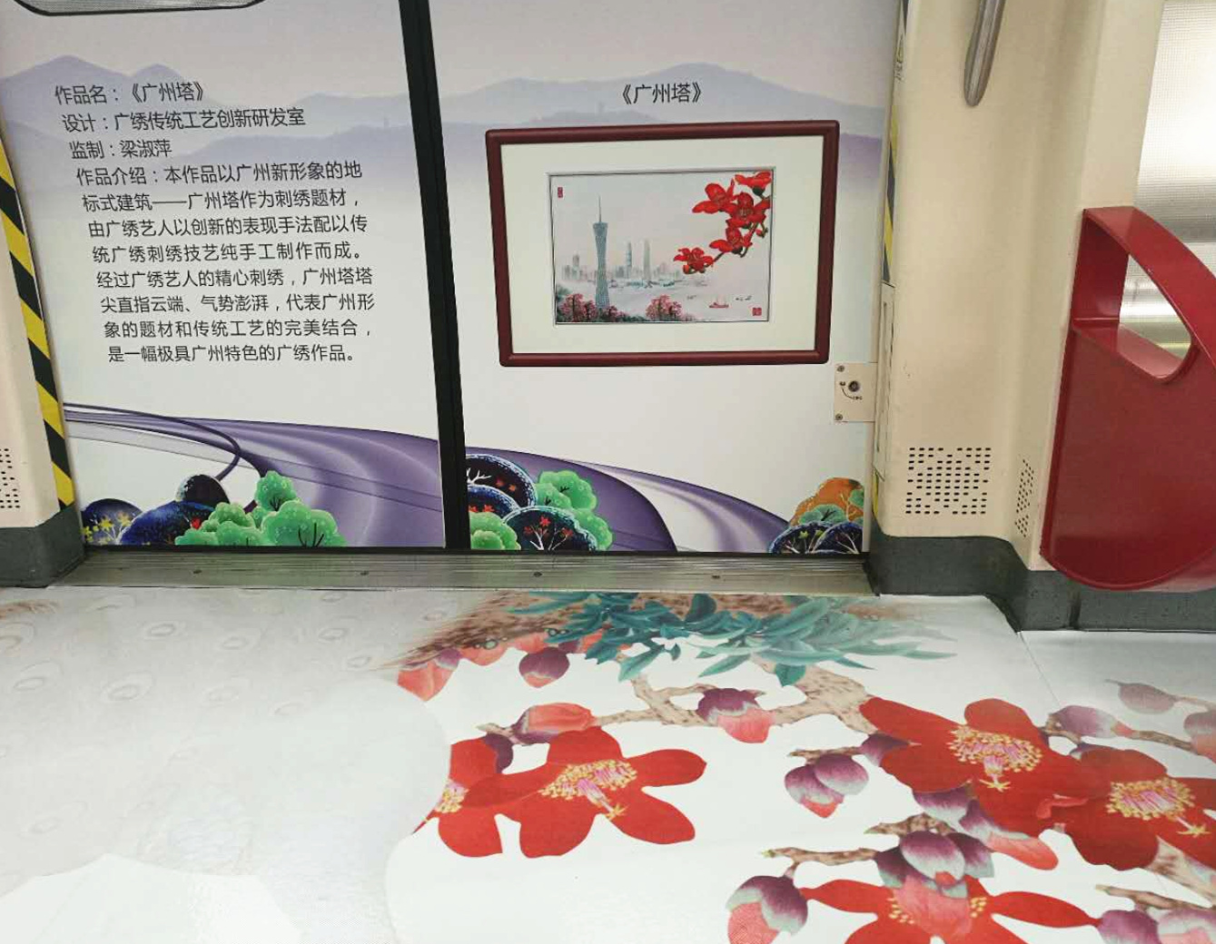 2月5日,广佛地铁专列" 南粤号 "正式出列,四节车厢分别呈现广绣、广彩、石湾陶塑、佛山剪纸四项非遗文化,每节车厢上分别精选了 20 多幅非遗文化传承大师的作品和大师的介绍,让乘客置身于非遗文化的海洋中,感受广佛两地优秀传统工艺的熏陶。由我司制作的广绣作品介绍亦首次在“南粤号”车厢中展示,向民众展示作品的精髓。