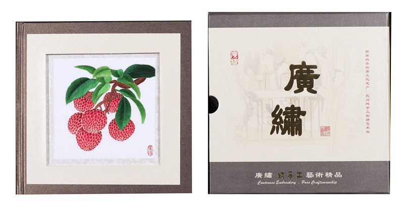 刺绣的作品以岭南特有的红棉和荔枝作为刺绣主题,由广绣艺人以传统广绣刺绣技艺纯手工制作而成,并采用软裱的制作形式,以原生态的形态呈现于客人面前,并无玻璃的阻隔,能令客人更好地看清蚕丝特有的丝光及传统的广绣刺绣技艺。软裱制作而成的绣画,能够在产品中单独取出,方便客人选择其他不同形式或材料的框架对其进行个性化装裱。