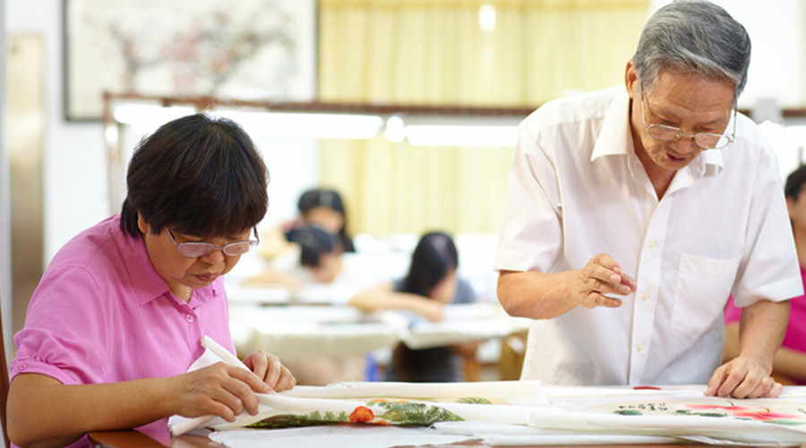 中国刺绣艺术大师许炽光、广东省工艺美术大师伍洁仪向拍摄人员讲解广绣制作过程